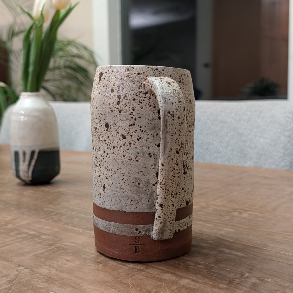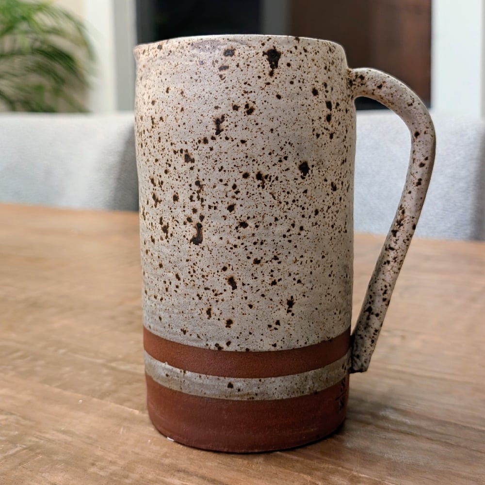 With its generous handle and smooth spout, it serves perfectly as a table pitcher for your favorite beverages. When not in use for serving, its height and weight make it an ideal vase for heavy-headed flowers like sunflowers or hydrangeas, or dried beauties to behold year round. The warm, speckled finish and exposed clay base add a rustic, organic touch to any surface.