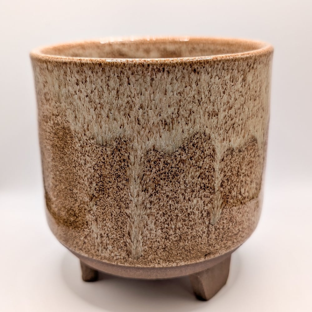 This wheel-thrown stoneware planter is elevated—literally—by three hand-sculpted feet, giving it a light, modern silhouette. The glaze features a lush, creamy white top that melts into a deep golden-tan speckle, leaving the very bottom and the feet in their natural, toasted clay state for a beautiful earthy contrast.