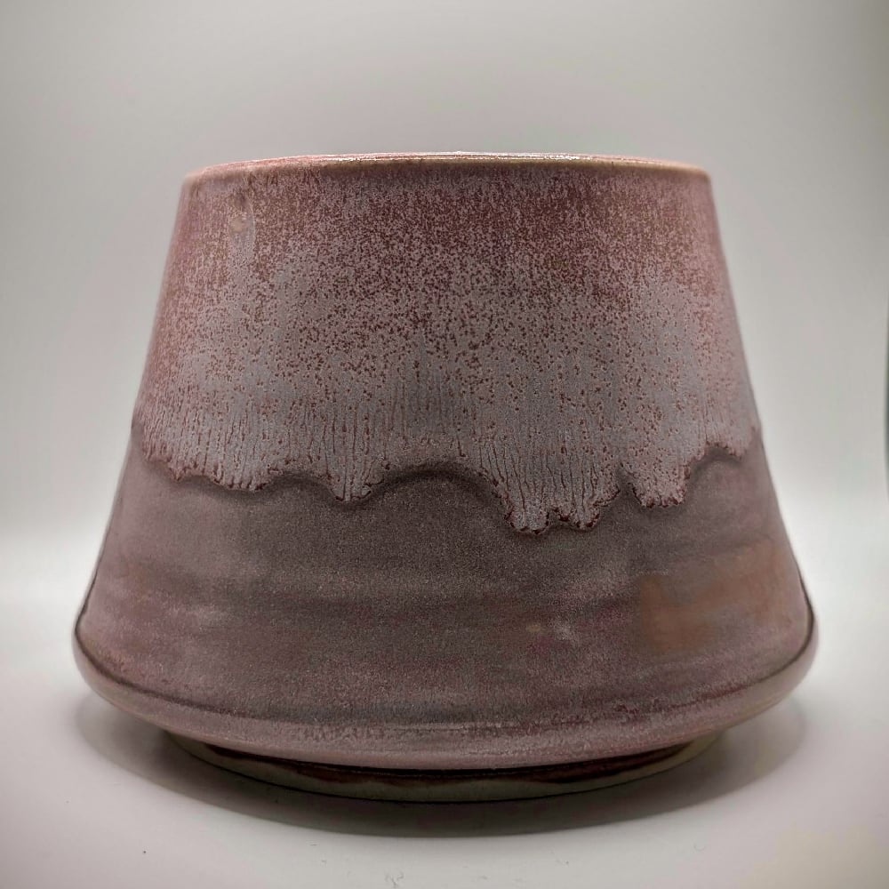 This wheel-thrown stoneware planter features an elegant, rounded shape that tapers toward a refined rim. Finished in complex, multi-layered mauve glazes, the surface has a misty, frosted texture that shifts beautifully in the light. Even more beautiful when the sun hits it. Its wider-than-average base provides excellent stability for top-heavy plants.